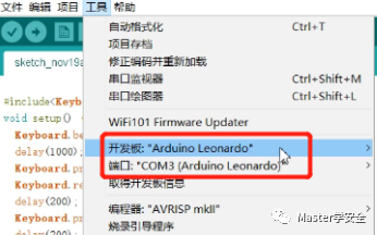 先将淘宝买好的badusb插入到电脑中打开 arduino 开发板选择arduino leonardo还有com口