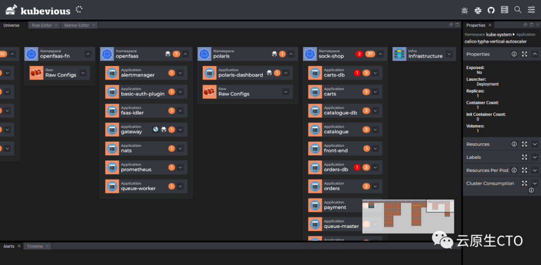 集群和配置是以应用程序为中心的视图,即使对于简单的应用程序,在 Kubernetes 上部署应用程序也需要不同的对象。通常,它需要不同的命令来列出和聚合所有创建的资源。Kubevious 能够将每个资源链接到单个消耗性框或视图中,以快速获得整个应用程序对象的概览。