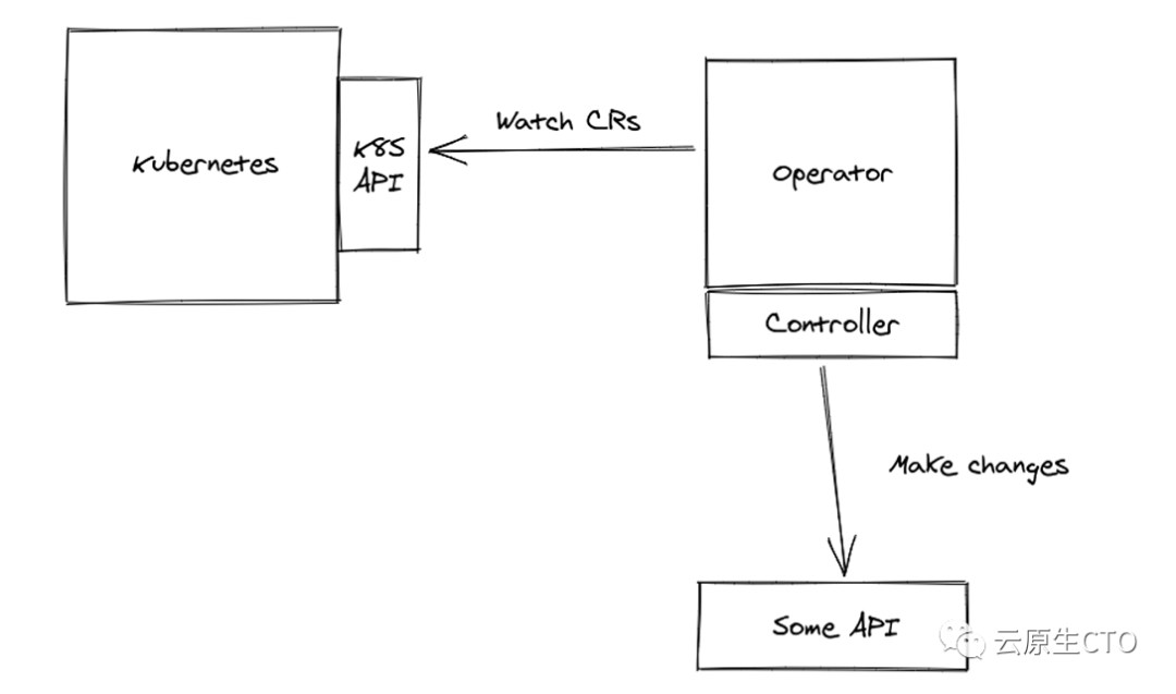 换句话说,operator只是连接到 Kubernetes API,以监视与自定义资源相关的事件。基于这些事件,我们执行控制器。控制器提供确保我们与目标域协调的实现。请注意,通过观察事件,我们会收到整个资源作为事件负载。因此,我们收到了一个声明性描述,它定义了我们的目标域对象应该是什么样子。在控制器中,我们获取整个自定义资源,更准确地说是其中的.spec 一部分,我们将声明性描述转换为命令式操作,通常是目标系统的 API 调用(可以是 Kubernetes API 或任何其他)。