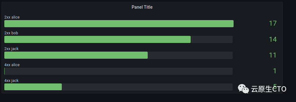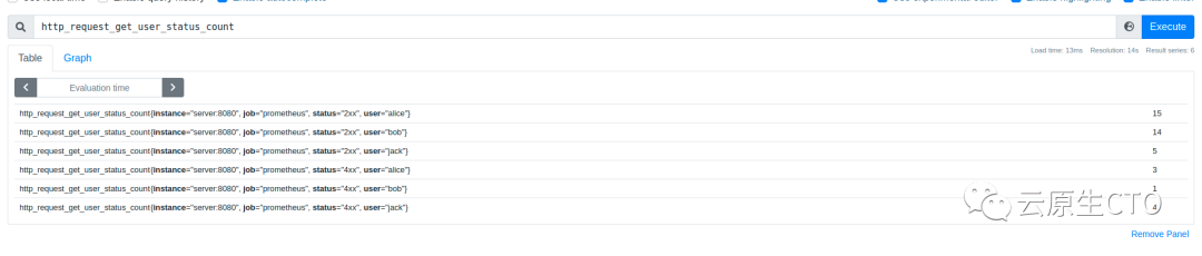 Prometheus 应该在http://localhost:9090 上运行。在搜索表达式中,如果您键入「http_request_get_user_status_count」,您应该会看到到目前为止生成的数据。就像是:
