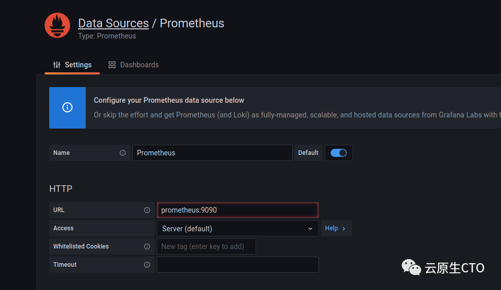 我们需要做的第一件事就是添加prometheus作为数据源。要做到这一点,在左侧面板上,点击齿轮图标,然后在DATA来源,最后添加数据源。选择 Prometheus 并在 URL 上输入:prometheus:9090,如下图所示: