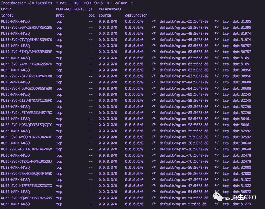 如您所见,KUBE-SERVICES链中的一个目标是KUBE-NODEPORTS链。这会列出所有cluster ip的流量地址并关联对应的svc,刚才我们部署的nginx,正在iptables当中处理了流量