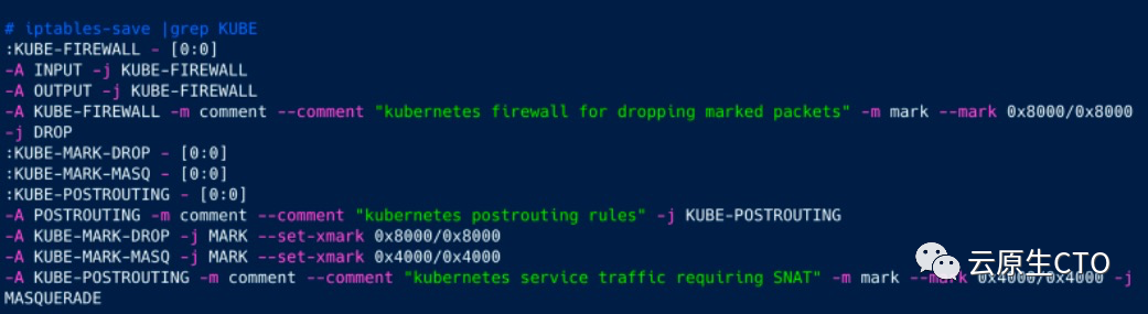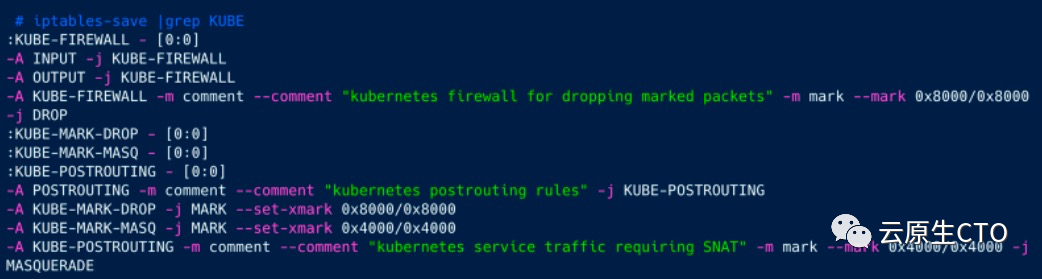 如果你熟悉iptables,那么我们可以看到KUBE-SERVICES目标中有一个由创建的链kube-proxy。现在列出该链中的规则,请参见下面的示例: