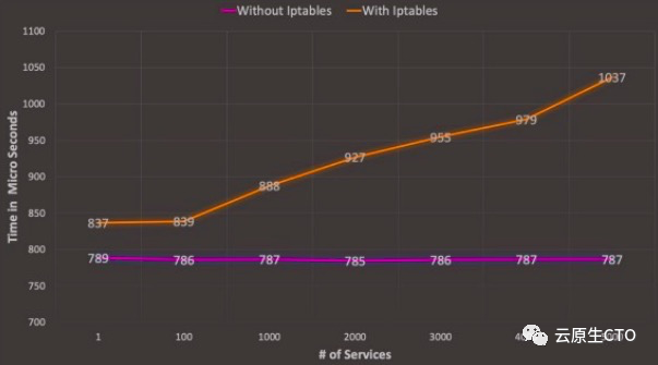 如果我们通过将集群中nginx服务的数量从1,100,1000,2000,3000,4000,5000增加到两个设置来运行此测试,并绘制比较图表,我们可以看到