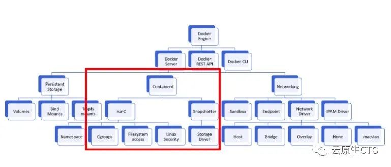 如前所述,Kubernetes只能与CRI通信,因此要与Docker通信,必须使用网桥服务。这是第一个原因。为了解释下一个原因,我们必须对Docker架构进行一些解释。首先请参考下图。