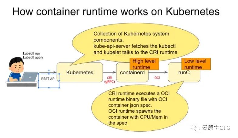 每个作为kubelet的容器化应用程序都通过IPC在gRPC中进行通信,并且运行时也在同一主机上运行;CRI运行时负责从kubelet获取请求,并执行OCI容器运行时以运行容器。这有点复杂,接下来我们将通过图表进行说明。