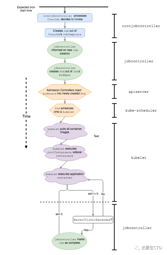 cronjobcontroller 处理并决定调用CronJob cronjobcontroller 根据CronJob的Job规范创建Job jobcontroller 注意到新创建的Job并创建一个Pod Kubernetes准入控制器将Sidecar Container规范注入Pod规范* kube-scheduler 安排Pod到kubelet上 kubelet 运行Pod(拉出所有容器图像) kubelet 启动所有杂物箱* kubelet 启动应用程序容器* Lyft的Kubernetes堆栈独有