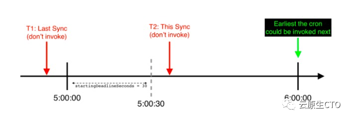 示例时间线(从的角度来看cronjobcontroller)在startingDeadlineSeconds特定的每小时CronJob中超出了该时间线-CronJob错过了运行,直到下一个预定时间才会被调用