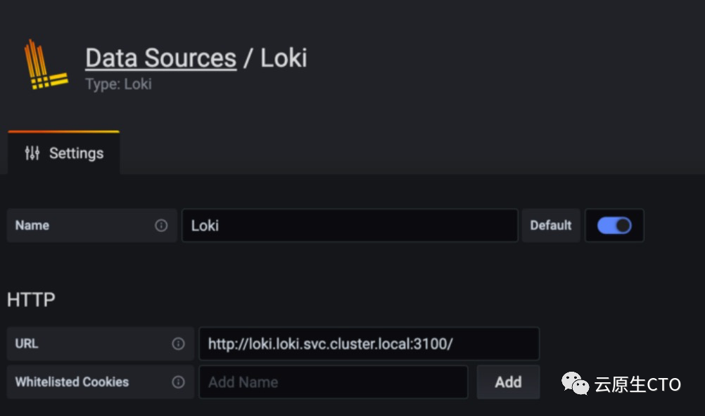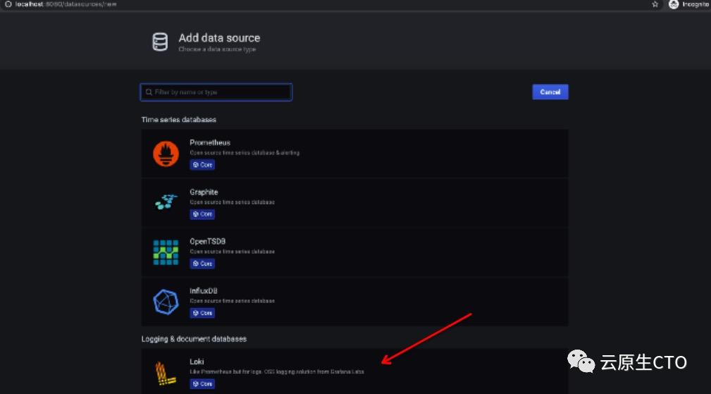 在“数据源”视图中,单击“添加数据源”,然后选择“ Loki”