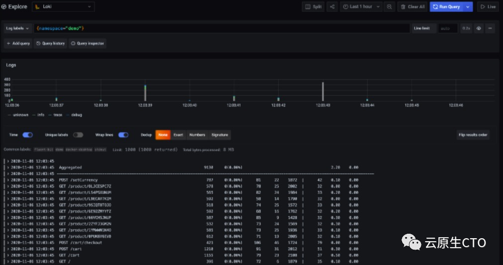 现在Grafana已连接到Loki,我们可以从部署在demo名称空间中的示例应用程序中查询日志,以观察其行为。我们可以寻找错误,通过跟踪ID查找事务,并做许多更强大的事情,包括可视化模式和趋势。Loki的查询语言称为LogQL。在Grafana应用程序中,从侧面板中选择“浏览”。选择上一步中添加的Loki数据源。在查询框中,添加{namespace="demo"}并点击“运行查询”。你可以看到正在返回的日志