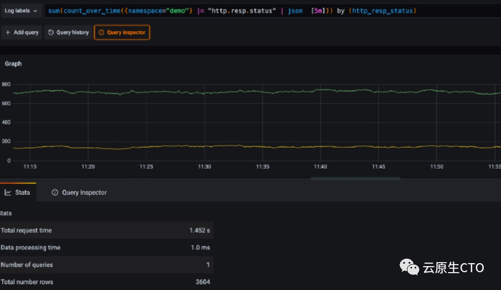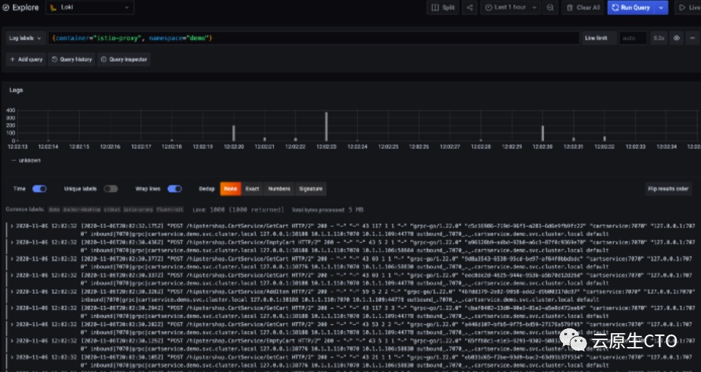 你可以添加更多过滤器和标签来缩小想要查看的日志的范围。例如:要查看来自演示名称空间中Istio-sidecars的日志,请使用查询{container="istio-proxy", namespace="demo"}。我们还可以查找未以所需状态代码结尾的http请求{namespace="demo"} |= "http.resp.status"!= "200"`
