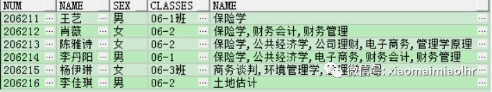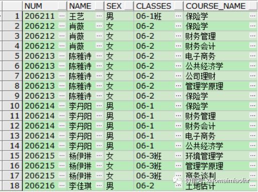 17INSERT INTO T_ROW_COL_LHR(NUM,NAME,SEX,CLASSES,COURSE_NAME) VALUES ('206213','陈雅诗','女','06-2','保险学');