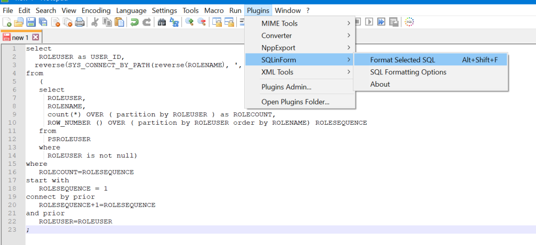 当sql长到一定长度,直接放进sql developer非常不方便,推荐一款notepad++插件 sqlformat
