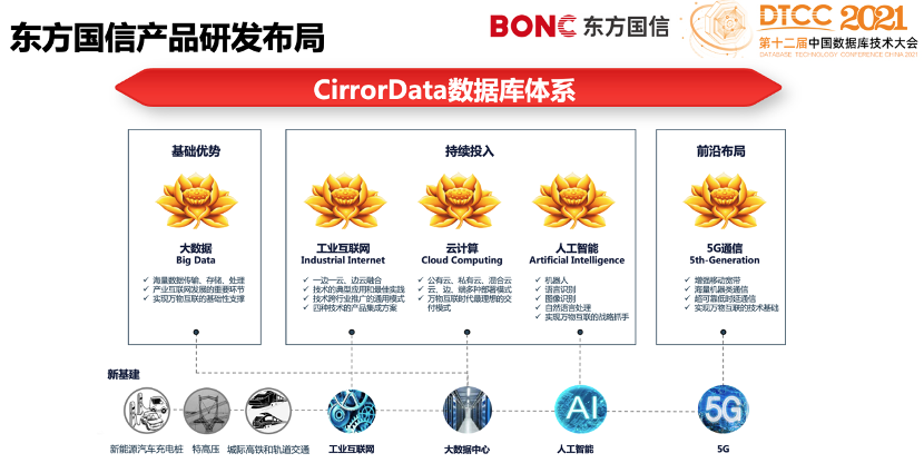 二十年前,我们很多人一起经历了Internet浪潮,在那个浪潮里,成就了很多当年的互联网公司。我们公司也在Internet浪潮中发展壮大,同时也对下一个技术浪潮进行了战略上的思考和预研。我们认为:下一个技术浪潮将是万物互联,在这个大浪潮里面,会有几个分支,比如说工业互联网、5G,以及大数据、云计算、人工智能。这些分支会汇聚成一个万物互联的大浪潮。因此,东方国信在这几个技术方向都有投入,都有自己研发的产品。对应这五个主流技术分支的产品我们称为五朵金花,这五朵金花需要有一个根基,这个根基就是接下来要讲的CirroData数据库。只有把底层数据库做好了,底层的有价值的数据资产才能真正发挥作用,五朵金花的基础架构才牢固,才能枝繁叶茂发展起来。