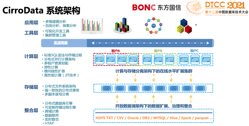 董山结合东方国信CirroData分布式数据库的技术发展历程讨论了国产数据库行业的发展及现状;介绍了CirroData “放眼世界,自主创新“ 的发展战略和坚持国产化的创新技术路线;以“具有中国特色的数仓”为思路详细展示了CirroData六款分布式数据库产品;最后向现场听众描绘了CirroData “多维数仓+湖仓一体“ 的产业蓝图。