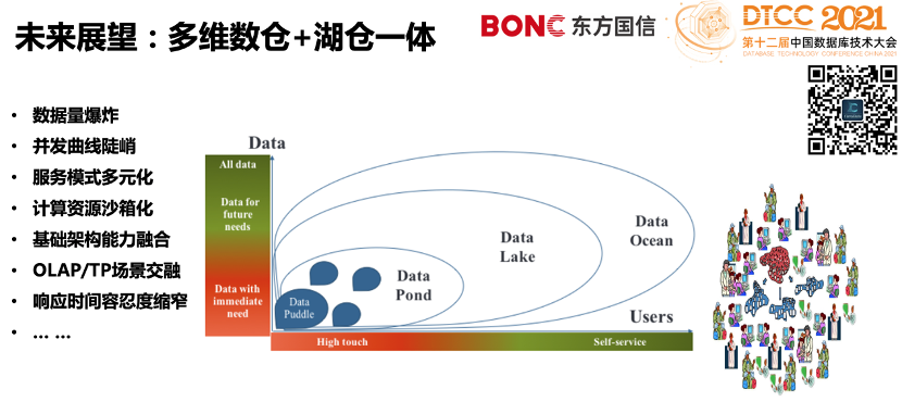 准确地说,任何事物的未来都是很难确定的,但我们认为,大的方向还是有迹可循的:数仓将沿着拉近现实世界与数据世界距离的方向不断发展。具体来看:在当今的现实世界中,互联网的深度改造,使得社会越来越扁平化、碎片化,节奏也越来越快,对数仓建设提出了一系列挑战,因此,数仓将会从多个维度发展相关技术,来应对这些挑战。不仅Data和User这两个平面的维度,还将从数据规模、种类、数据、准确度、价值,用户自服务、对象,数据编目、治理和展现等多个维度进行深度进化,演进为一个多维+湖仓一体的数仓。