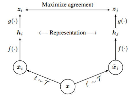 首先,如何通过无标注数据构造正负样本呢?本篇文章提出的解决方案是,利用数据增强的手段,构造正样本,并简单地将训练过程中同一批(batch)的其余数据视为负样本。其中的数据增强操作,作者采用了随机裁剪(random cropping)、随机色彩扭曲(random color distortion)和随机高斯模糊(random Gaussian blur)。