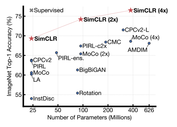 实验方面,作者采用ImageNet作为实验的数据集。作者在两种设置下对于表征学习的效果进行了验证。第一种叫做线性验证(linear evaluation),保持编码器参数固定不变,训练线性分类器并检查分类效果。可以看到,SimCLR方法取得了比其余自监督学习方法更好的效果,并在参数数量较大的情况下(4x)可以比肩监督学习的基线模型;