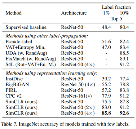 第二种叫做半监督学习(semi-supervised learning),即在对比学习后,使用少量数据进行精调(finetune)进一步优化模型。可以看出,在这种类似于小样本学习(few-shot)的场景下,模型取得了不错的泛化效果,作者在进一步的实验中也证明,即使使用全量样本进行精调,预先进行的对比学习也能使模型效果有约2%的提升。