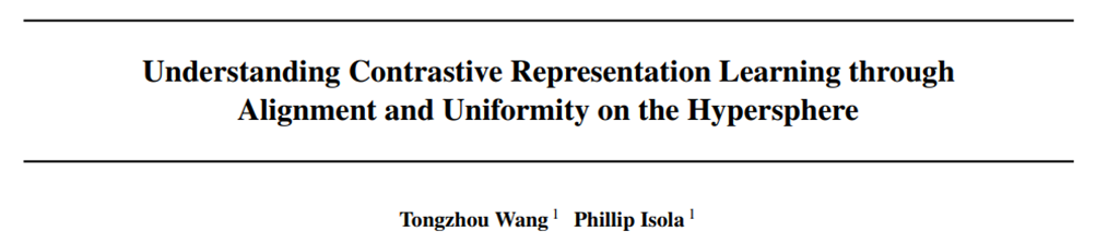 在表征学习中,我们希望学到的表征具有什么样的性质呢?作者提出了两种性质:对齐性(alignment)和一致性(uniformity)。前者指的是,具有相似特征或语义的数据,应该有相似的表征;后者指的是,从整体数据分布上看,编码得到的表征应该均匀的分布在超球体上,而不是聚集在某个特定的狭窄区域。这两个性质很符合直觉。对于具体评价的数学计算公式,可以参照第一篇论文。