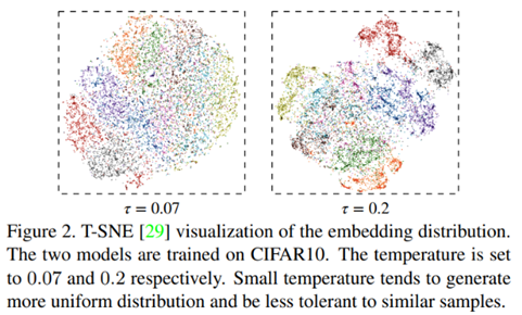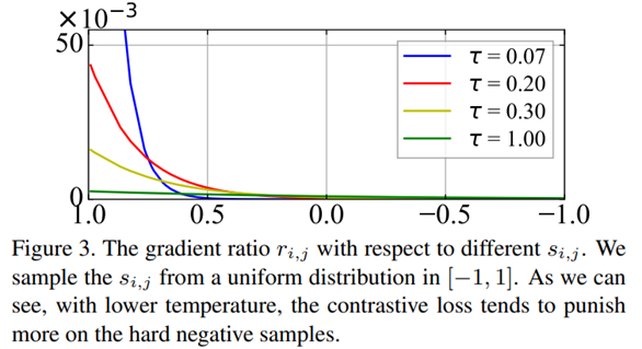 公式中的τ被称作温度超参(temperature hyperparameter),它负责保持对齐性和一致性之间的平衡。温度参数会将模型参数更新的重点,聚焦到有难度的负例,并对它们做相应的惩罚,难度越大,也即是与x距离越近,则分配到的惩罚越多。所谓惩罚,就是在模型优化过程中,将这些负例从 x身边推开,是一种斥力。也就是说,距离 x越近的负例,温度超参会赋予更多的排斥力,将它从 x推远。而如果温度超参数设置得越小,则InfoNCE分配惩罚项的范围越窄,更聚焦在距离比较近的较小范围内的负例里。同时,这些被覆盖到的负例,因为数量减少了,所以,每个负例,会承担更大的斥力。极端情况下,假设温度系数趋近于0,那么InfoNCE基本退化为聚焦在距离 最近的一到两个最难的实例。