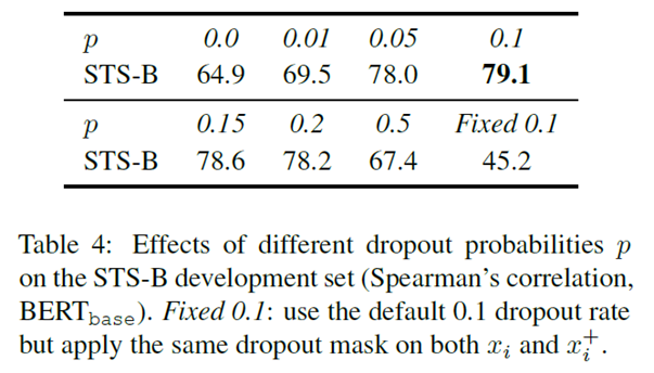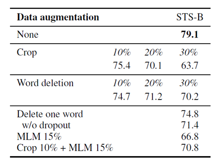 不同于图片像素的近似连续性,自然语言往往以离散的方式呈现。在对抗学习领域中,对于数据增强操作,也做过多种尝试,诸如单词替换、换序、随机删减等方式。在无监督学习的设置下,本文中作者创新地将dropout操作视为一种“最小的”数据增强的方法。对于同一条语句,在训练中使用两次不同的dropout mask,即视为一组互为正例的样本对。在负样本构建中,与SimCLR一致,使用同一批内的其余数据即可。有意思的是,消融实验表明,只用dropout作为数据增强手段反而取得了最好的效果,引入其余手段反而会损害模型的表现。