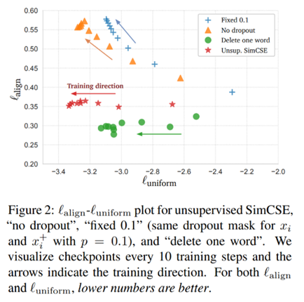进一步的问题是,dropout真的发挥了数据增强的作用,还是这种表现是一种偶然现象呢?从表4可以看出,当对一对正样本使用固定的dropout mask时,模型的表现出现了显著的下降,从79.1降至45.2。而从图2中可以看出,随着训练进行,dropout策略在表征的一致性加强的同时,维持了良好的对齐性,而在没有使用dropout策略的实验中,对齐性显著随训练进行而降低。这在一定程度上解释了dropout策略的作用,证实了作者的猜想。