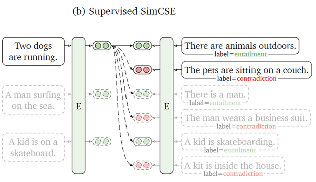 从视觉领域对比学习的成功可以看出,对比学习在表征学习,尤其是无监督的环境下,能起到不错的效果。一个自然的想法是,在NLP的句表示学习任务中,加以应用。在本文中,作者在监督学习和无监督学习的环境下都进行了尝试。由于应用的框架与SimCLR类似,我们在此就不再做额外介绍,而主要讨论样本构建问题。