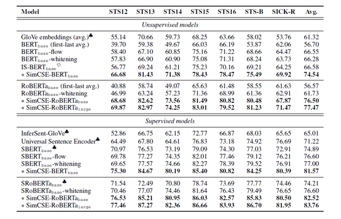 除了无监督的设置以外,作者还尝试了利用有标注数据集中的监督信号,进一步强化表征学习效果。其中,自然语言推理(natural language inference)数据集展示了良好的效果。NLI数据集由句子对构成,每对之间的关系包括体现(entailment)、中性(neutral)以及矛盾(contradiction)。NLI数据集对于模型语言理解有着强化作用,同时数据之间的语法重叠较无标注数据更少。作者尝试将体现关系的样本作为额外的正样本,矛盾关系的样本作为负样本,进行有监督的对比学习,取得了良好的效果。