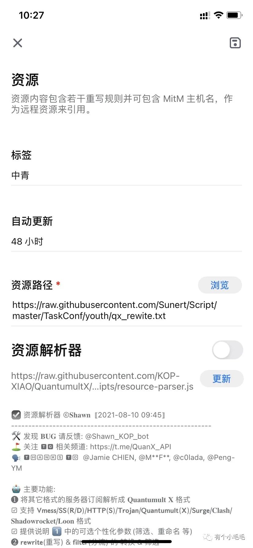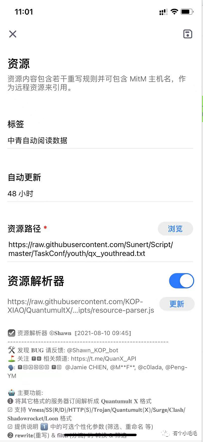 安装完成后,圈x右下角小风车-重写-引用-右上角+资源路径填写:https://raw.githubusercontent.com/Sunert/Script/master/TaskConf/youth/qx_rewite.txt保存