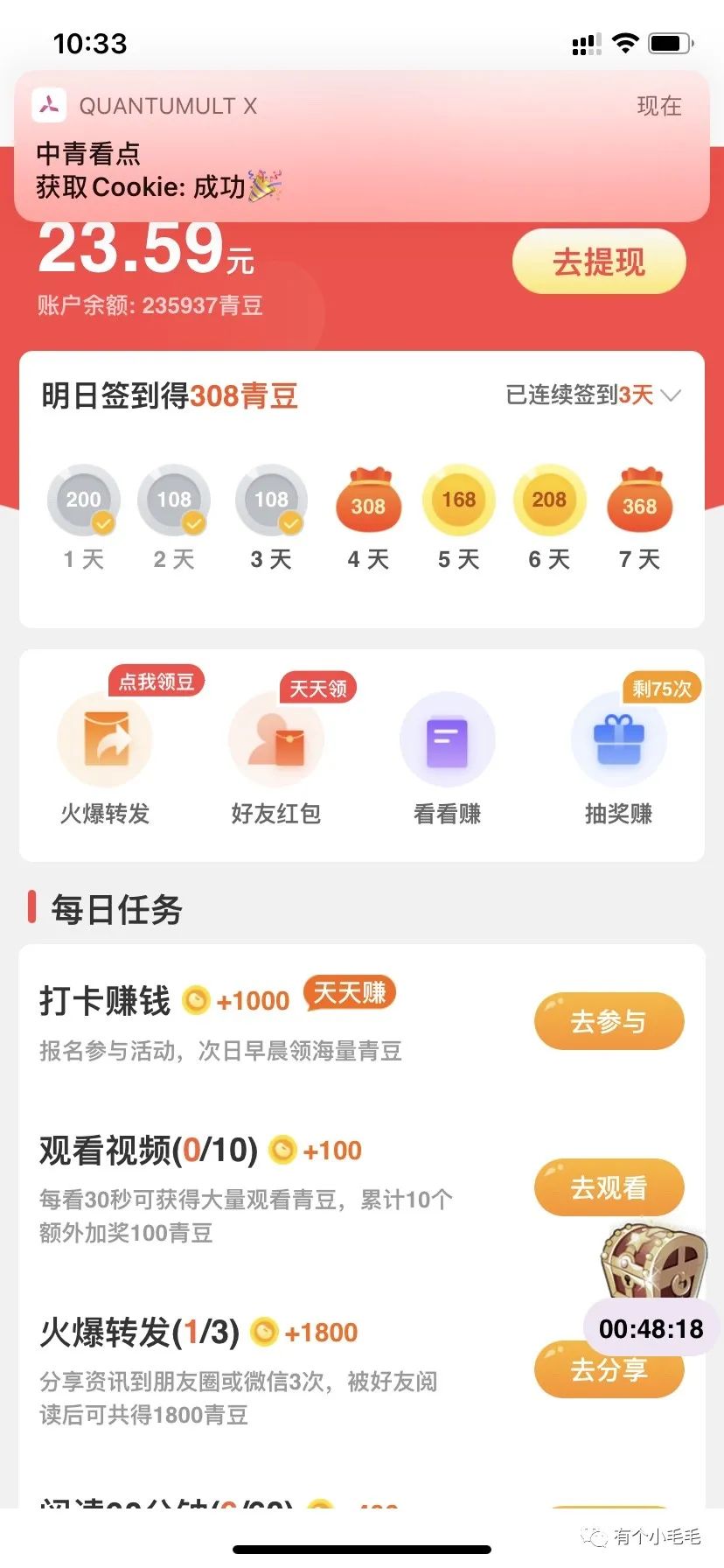 打开中青看点极速版2.02版本,点击我的-任务中心,圈x就会弹出获取ck成功。