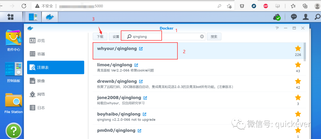 群辉 NAS 的朋友打开 docker 应用在注册表搜索 qinglong 列表中的第一个选择点击下载,等待下载完成,我们的青龙面板镜像就拉取完成了。