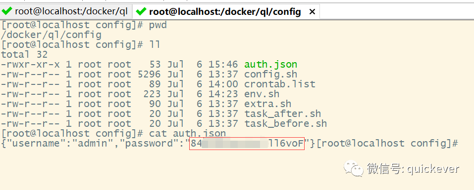 默认用户名为 admin 密码是 adminadmin 点击登录,会重置密码,进入/docker/ql/config 目录下查看 auth.json