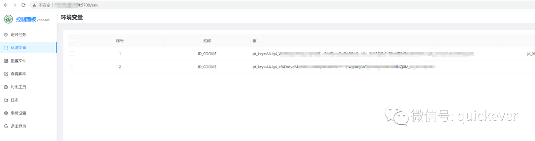 这时我们再返回到青龙面板,在环境变量菜单下可以看到我们扫码添加的 JDCOOKIE 现在可以愉快的薅羊毛了 O(∩∩)O 哈哈~