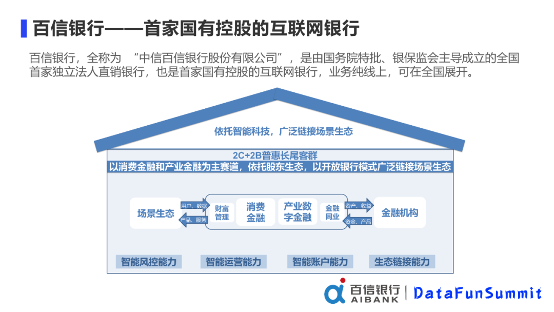 作为一家纯线上的互联网银行,百信银行实现了百分之百的线上化运营,以及百分之百的线上账户能力和全功能账户体系。这种纯线上的运营模式更需要数据来提升运营及经营的决策效率。