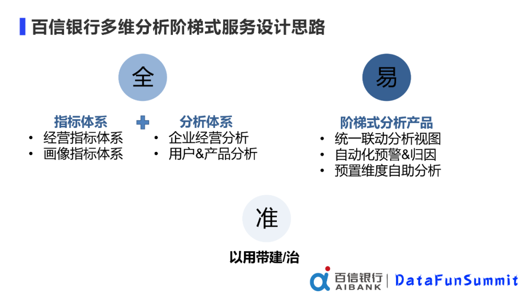 针对“全”的诉求——第一,针对指标体系,以及围绕指标维度体系搭建,形成经营指标和画像指标两套体系,从数据资产的角度保证供给指标体系的全面性。第二,针对分析体系,围绕企业经营、产品和用户分析搭建全链路的分析体系。