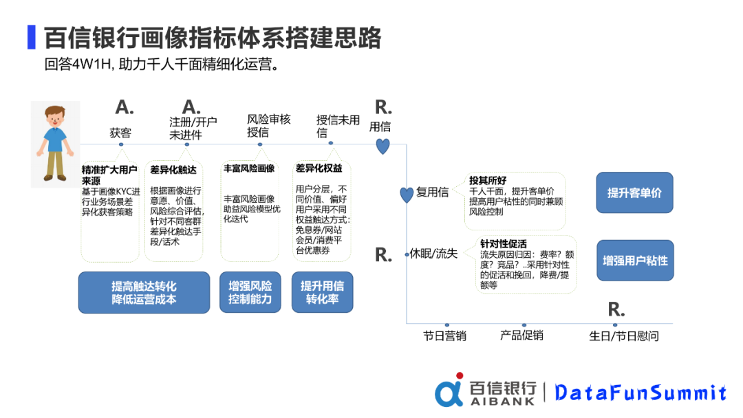 现在分享横切的思路,以百信银行用户画像指标体系为例展开。采取的是抽象CRM的思路,对用户进行全生命周期的客户关怀,希望成为客户可靠友好的金融伙伴,在用户需要的时候进行触达,在用户不需要的时候不去打扰。