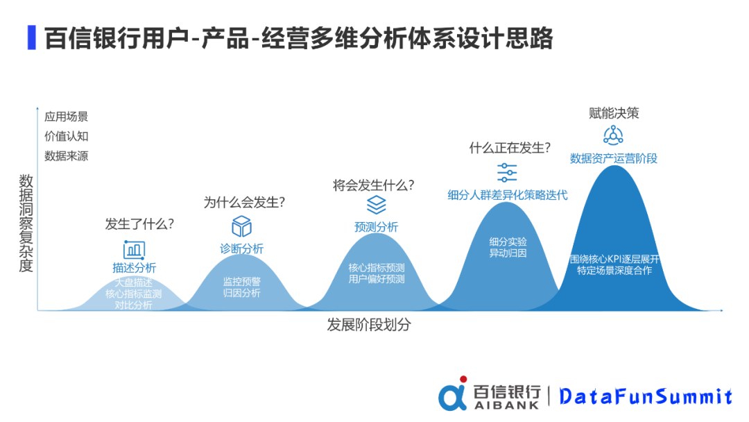 第四阶段,采用细分人群差异化策略迭代,回答“什么正在发生?”。作为一家年轻的线上直销银行,迭代的业务需要灵活的数据分析支持。所以除了进行描述、诊断和预测分析,还需要支持业务进行细分人群的定位、细分人群的差异化策略及细分实验的效果比对和异动归因,进而判断什么事正在发生,并据此迭代核心指标,更准确描述大盘的现状和更有效支持运营动作。例如初期的用户核心指标为持仓客户数量,当业务发展到一定程度,我们发现持仓客户的分布中很高的比例是持仓低于某额度且不活跃的客户。结合业务分析和发展目标,把核心指标修改为在一定时间区间范围内符合某额度之上的客户数量。