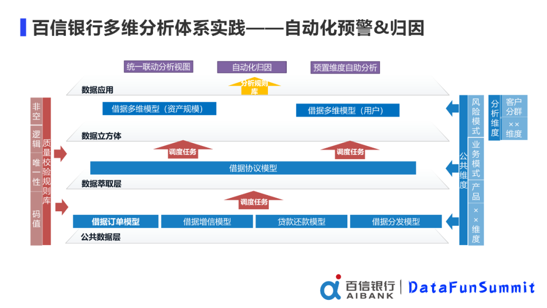 自下而上统一的数据供给和数据质量保障为数据分析保驾护航。通过公共数据层、数据萃取层和数据多维分析层逐层建构、融入公共维度和分析维度。同时完善质量校验规则库,从非空、逻辑、唯一性、码值等角度在调度任务中部署规则,在每个表生成时进行校验,进行数据质量保障。数据应用层则是沉淀业务分析规则库,实现自动化分析联动、预警及归因并支持自助分析。