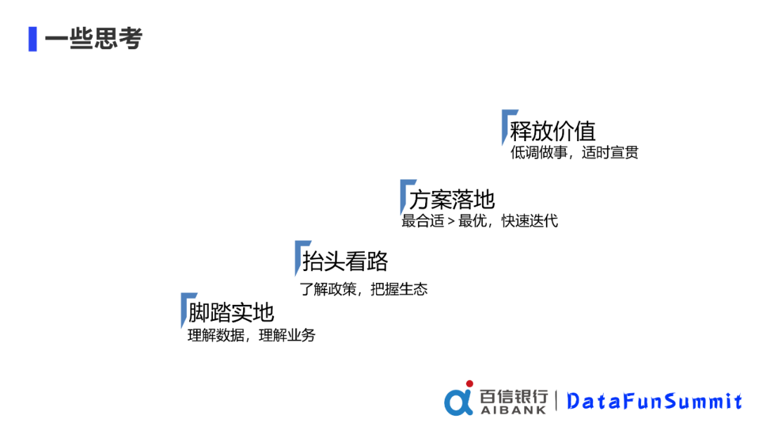 4. “释放价值”。低调做事,做扎实,并在适当的时候影响高层和其他团队。在工作中,跨团队demo以前的产品时,经常会听到“我怎么从来不知道有这样的思路,这样的服务方案?”。所适当宣传,碰撞思路,有助于更高效的迭代创新,释放数据价值。
