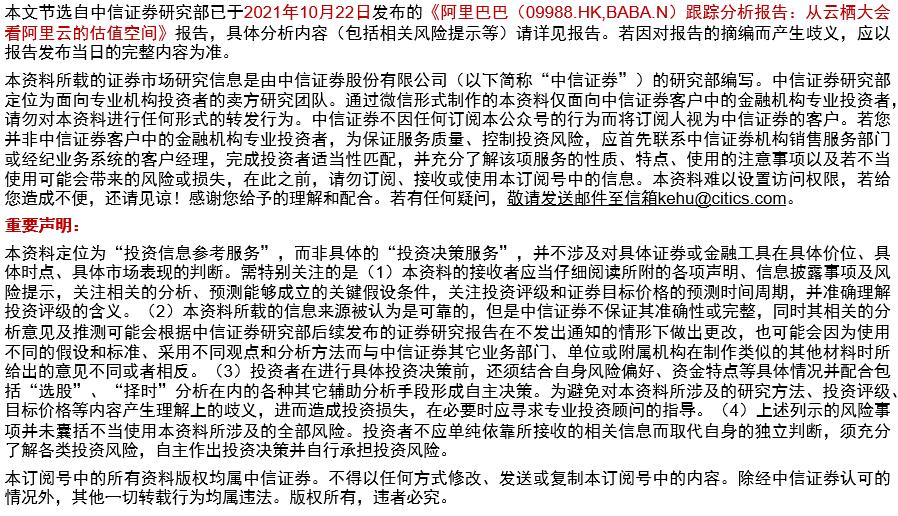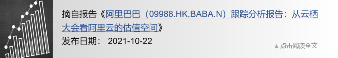 我们近期参加2021年云栖大会,通过两场主论坛、部分分论坛及云栖数字谷探索,近距离了解阿里云的倚天710、神龙4.0等核心技术、产品发布以及阿里云对产业数字化转型的赋能。当前市场对于阿里云的分歧在于由IaaS竞争格局的变化、EBITA Margin引发的估值空间的探讨。我们认为,未来云计算的竞争将由底层IaaS过渡为综合的云平台能力竞争。在本次云栖大会,我们见证了阿里云行业领先的技术优势、PaaS能力、快速完善的方案服务能力及实施交付生态。我们相信未来凭借云原生、开源生态、云钉一体战略的不断推进,政企数字化转型的持续落地,有望推动阿里云保持稳健增长,以及非IaaS收入占比、客户粘性的提升,驱动阿里云估值上行。