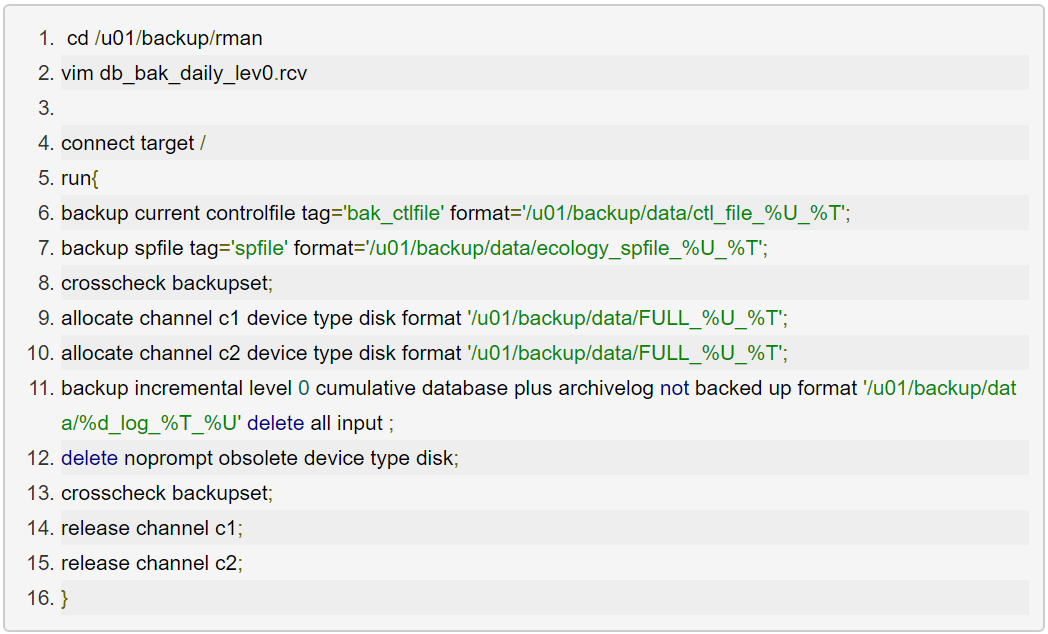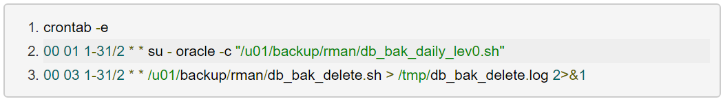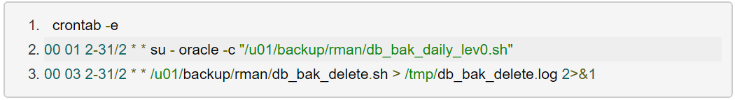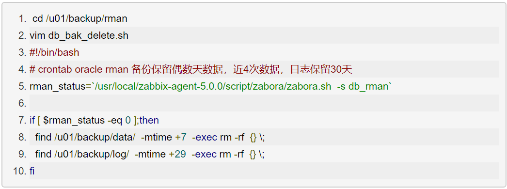 创建备份数据清理脚本, 并加入定时任务,只备份近4次数据,脚本会自动判断最近一次rman备份是否成功,不成功将不删除备份数据。这里我调用了 zabora.sh 脚本判断rman备份状态,sql语句也比较简单。