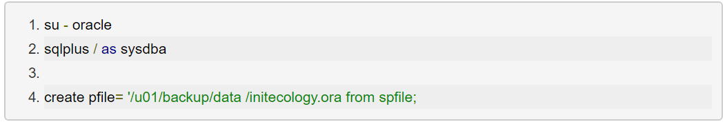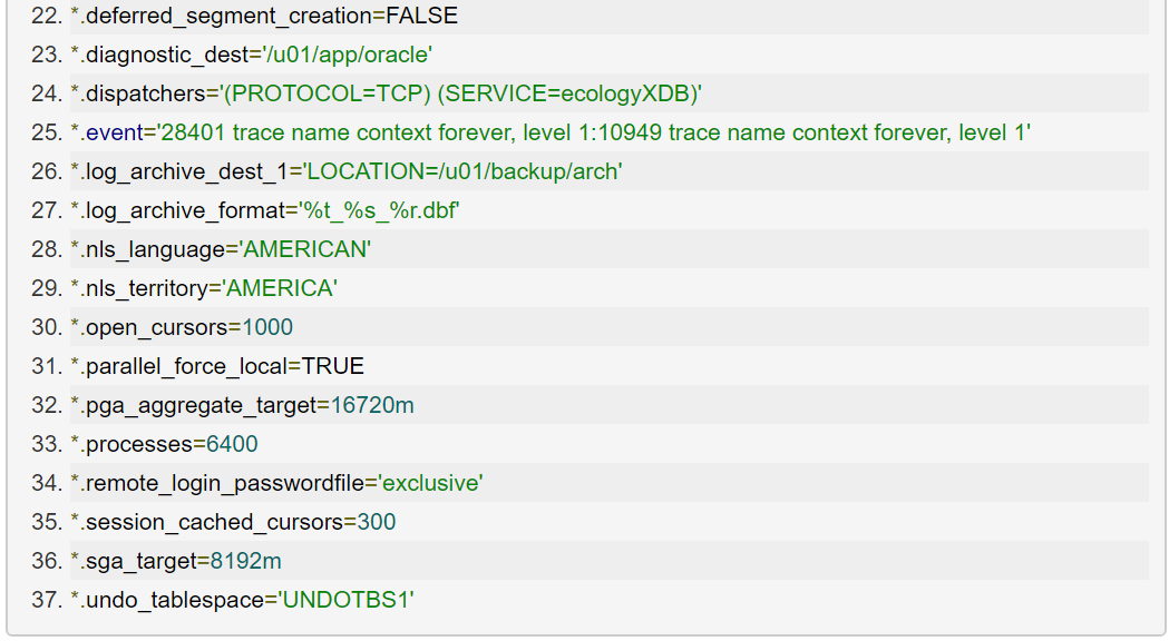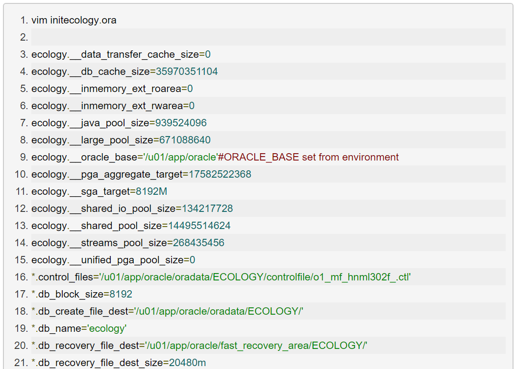 将此文件复制到oracle单机上/u01/app/oracle/product/19.0.0/db_1/dbs/initecology.ora 并进行修改,目的是将Oracle rac环境下的设置改为单机环境: