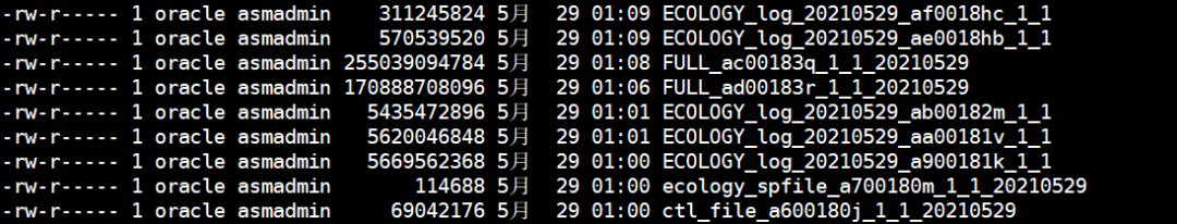 将Oracle rac环境下的全备份文件, 复制到oracle单机 u01/backup/data 目录下,以下操作均是在Oracle单机环境下进行。备份文件如下: