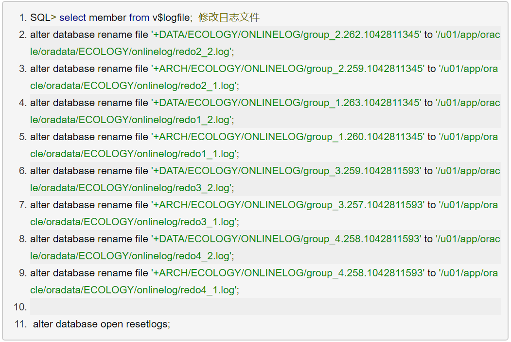 第三步已经完成了数据库的还原恢复,备份数据日志文件使用的是rac环境目录,需要更修改为单机版本。