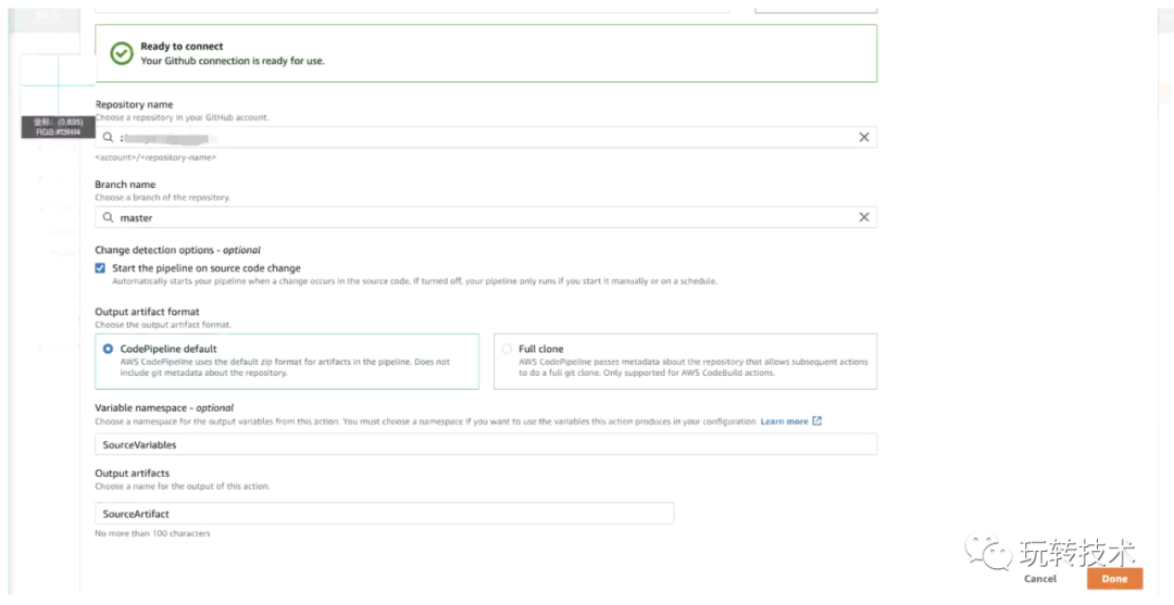 Output artifacts "定义codepipline输出下一步源名称,下一个目标引用(下面会看到)"