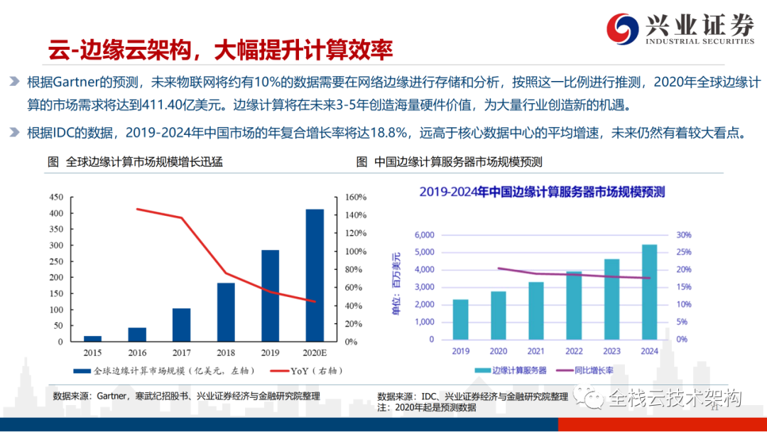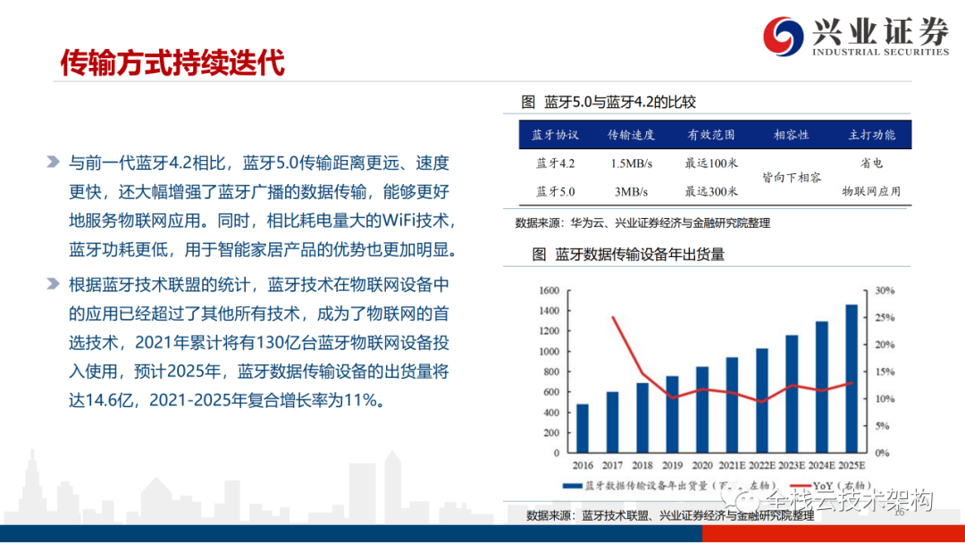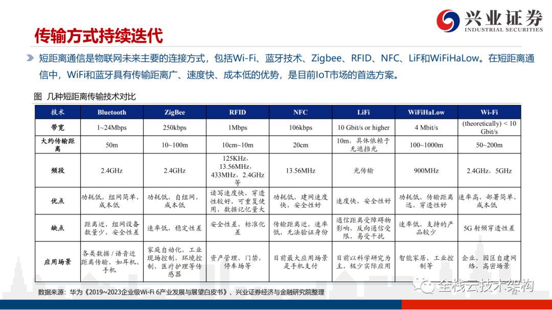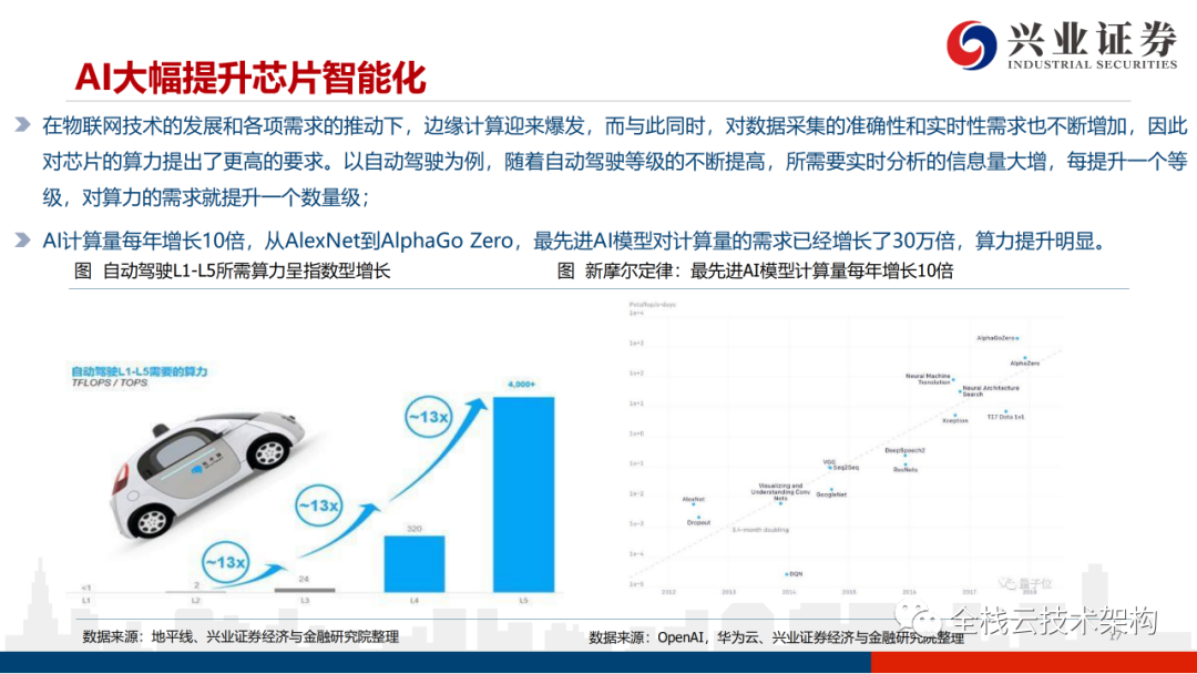 物联网通过智能感知、识别技术与普适计算等通信感知技术,广泛应用于网络的融合中,也因此被称为继计算机、互联网 之后世界信息产业发展的第三次浪潮。回顾物联网的发展历程,共可分为三个阶段。2009年,随着美国将新能源和物联网上升至国家战略、欧盟执委会发表欧洲 物联网行动计划、中国首次提出“感知中国”并在物联网行业进行战略部署,物联网行业正式进入快速发展期。根据IDC的统计,至2025年,全球数据量将达175ZB,呈指数级增长。在日益增长的数据实时性要求和安全性需求下, 终端的算力已经无法满足需求,因此在很多行业的应用场景,边缘计算将成为刚需。IoT边缘又称IoT Edge,是边缘计算在物联网行业的应用,其作为物联网边缘的“小脑”,在靠近物或数据源头的边缘侧就近提供 计算和智能服务,解决了把计算放在云端而引起的网络延时、网络拥塞和服务质量下降等问题,也极大缓解了终端的算力压力,为 物联网的进一步发展提供了可能性。短距离通信是物联网未来主要的连接方式,包括Wi-Fi、蓝牙技术、Zigbee、RFID、NFC、LiF和WiFiHaLow。在短距离通 信中,WiFi和蓝牙具有传输距离广、速度快、成本低的优势,是目前IoT市场的首选方案。在物联网技术的发展和各项需求的推动下,边缘计算迎来爆发,而与此同时,对数据采集的准确性和实时性需求也不断增加,因此 对芯片的算力提出了更高的要求。以自动驾驶为例,随着自动驾驶等级的不断提高,所需要实时分析的信息量大增,每提升一个等 级,对算力的需求就提升一个数量级;2、软件系统的融合