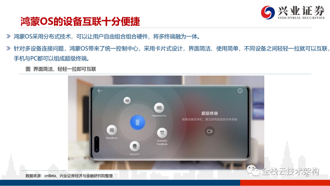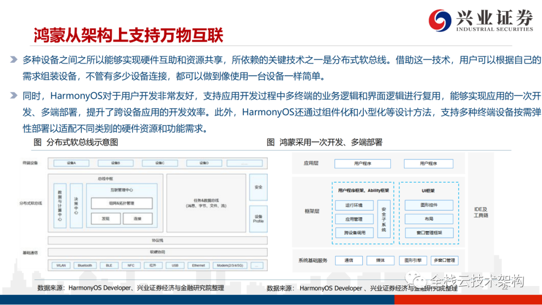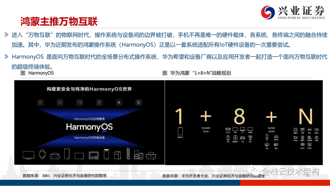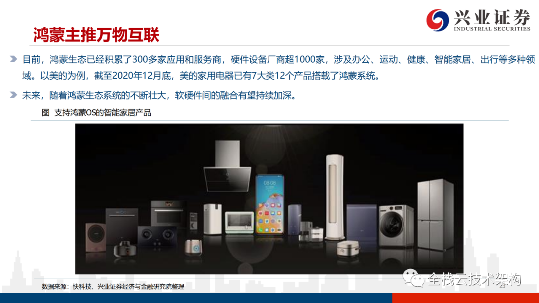 进入“万物互联”的物联网时代,操作系统与设备间的边界被打破,手机不再是唯一的硬件载体,各系统、各终端之间的融合持续 加速。其中,华为近期发布的鸿蒙操作系统(HarmonyOS)正是以一套系统适配所有IoT硬件设备的一次重要尝试。HarmonyOS 是面向万物互联时代的全场景分布式操作系统,华为希望和设备厂商以及应用开发者一起打造一个面向万物互联时代 的超级终端体验。鸿蒙OS采用分布式技术,可以让用户自由组合组合硬件,将多终端融为一体。针对多设备连接问题,鸿蒙OS带来了统一控制中心,采用卡片式设计,界面简洁、使用简单,不同设备之间轻轻一拉就可以互联, 手机与PC都可以组成超级终端多种设备之间之所以能够实现硬件互助和资源共享,所依赖的关键技术之一是分布式软总线。借助这一技术,用户可以根据自己的 需求组装设备,不管有多少设备连接,都可以做到像使用一台设备一样简单。同时,HarmonyOS对于用户开发非常友好,支持应用开发过程中多终端的业务逻辑和界面逻辑进行复用,能够实现应用的一次开 发、多端部署,提升了跨设备应用的开发效率。此外,HarmonyOS还通过组件化和小型化等设计方法,支持多种终端设备按需弹 性部署以适配不同类别的硬件资源和功能需求。目前,鸿蒙生态已经积累了300多家应用和服务商,硬件设备厂商超1000家,涉及办公、运动、健康、智能家居、出行等多种领 域。以美的为例,截至2020年12月底,美的家用电器已有7大类12个产品搭载了鸿蒙系统。未来,随着鸿蒙生态系统的不断壮大,软硬件间的融合有望持续加深。3、应用场景创新