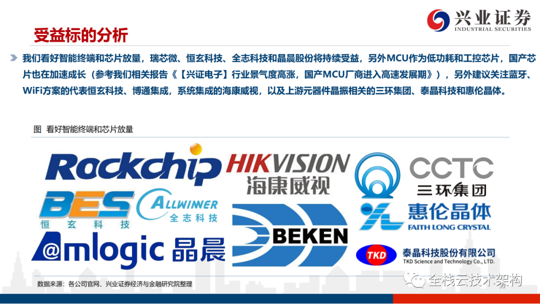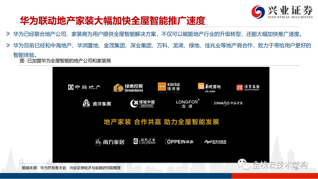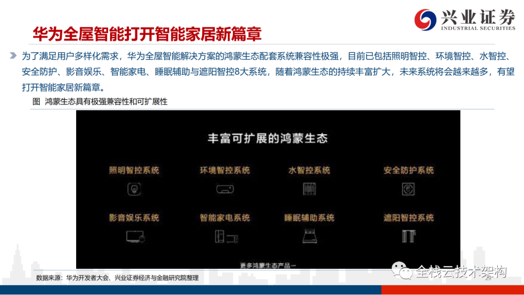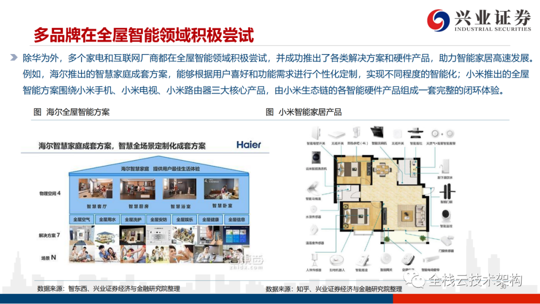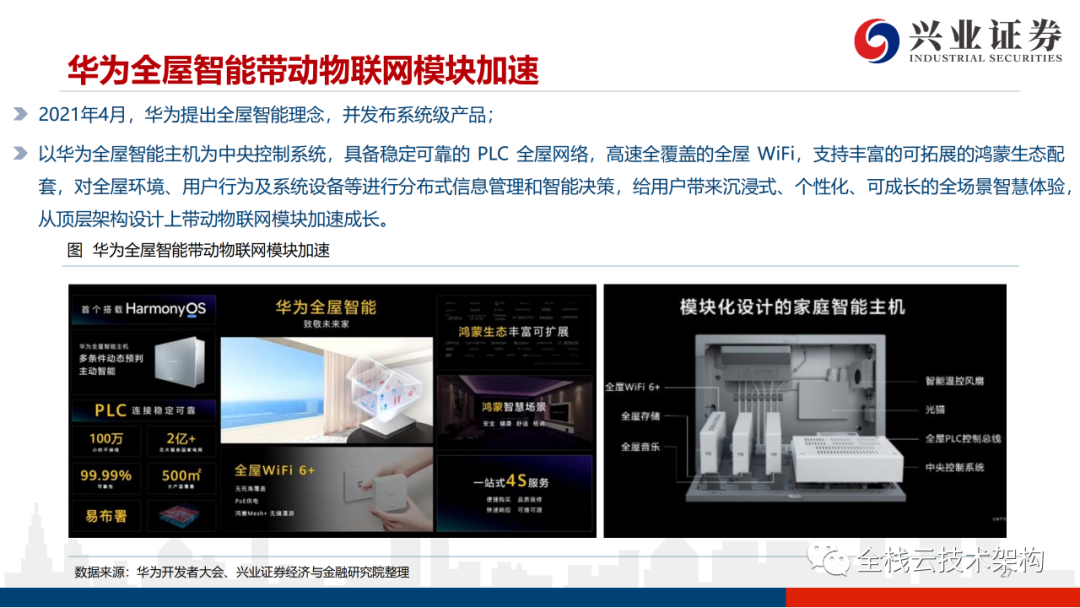 随着物联网的持续渗透,智能家居、智能驾驶、智慧城市、智慧商业等应用场景不断拓展,万物互联或许会在不久的将来成为现 实。2021年4月,华为提出全屋智能理念,并发布系统级产品;以华为全屋智能主机为中央控制系统,具备稳定可靠的 PLC 全屋网络,高速全覆盖的全屋 WiFi,支持丰富的可拓展的鸿蒙生态配 套,对全屋环境、用户行为及系统设备等进行分布式信息管理和智能决策,给用户带来沉浸式、个性化、可成长的全场景智慧体验, 从顶层架构设计上带动物联网模块加速成长。图 华为全屋智能带动物联网模块加速华为已经联合地产公司、家装商为用户提供全屋智能解决方案,不仅可以赋能地产行业的升级转型,还能大幅加快推广速度。华为目前已经和中海地产、华润置地、金茂集团、深业集团、万科、龙湖、绿地、佳兆业等地产商合作,致力于带给用户更好的 智能体验。为了满足用户多样化需求,华为全屋智能解决方案的鸿蒙生态配套系统兼容性极强,目前已包括照明智控、环境智控、水智控、 安全防护、影音娱乐、智能家电、睡眠辅助与遮阳智控8大系统,随着鸿蒙生态的持续丰富扩大,未来系统将会越来越多,有望 打开智能家居新篇章。除华为外,多个家电和互联网厂商都在全屋智能领域积极尝试,并成功推出了各类解决方案和硬件产品,助力智能家居高速发展。例如,海尔推出的智慧家庭成套方案,能够根据用户喜好和功能需求进行个性化定制,实现不同程度的智能化;小米推出的全屋 智能方案围绕小米手机、小米电视、小米路由器三大核心产品,由小米生态链的各智能硬件产品组成一套完整的闭环体验。全屋智能未来有望融入基础设施,从屋内走向屋外,并顺延到以人的行为场景所产生的的互联互通,与智慧城市与智慧 商业结合,实现全场景智能。4、重点企业分析