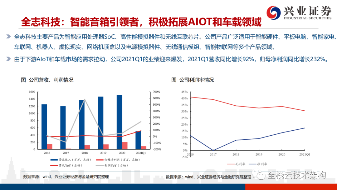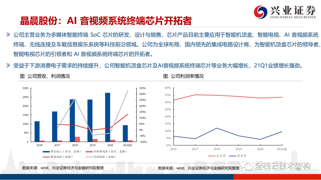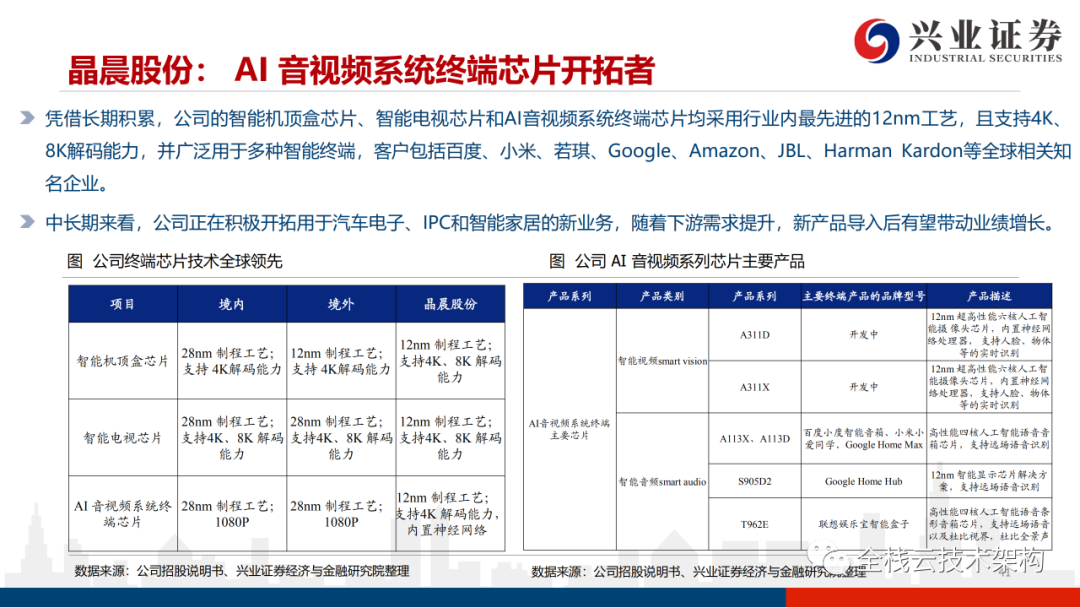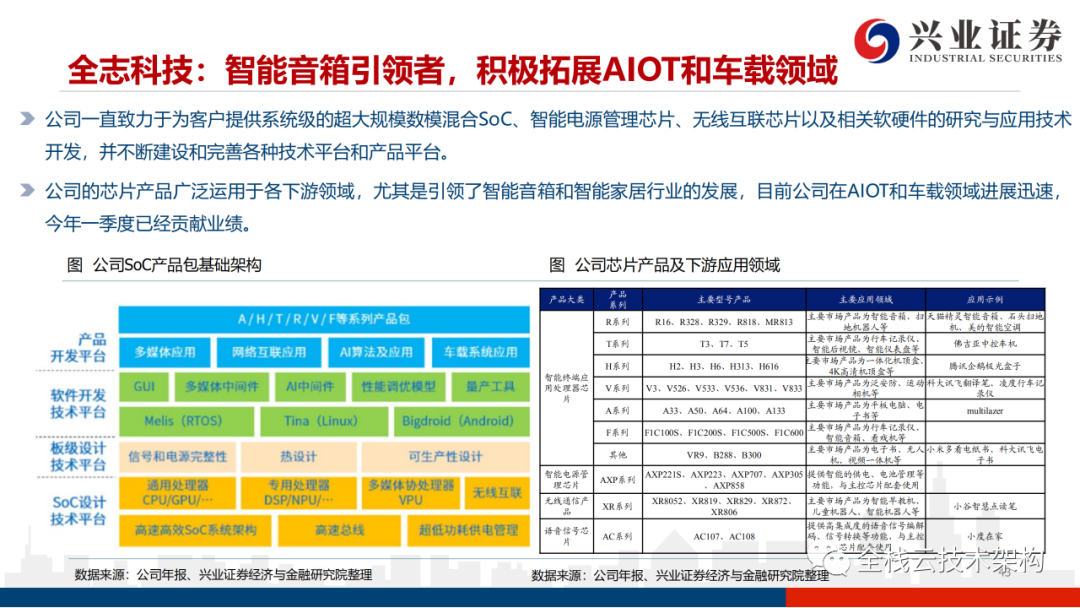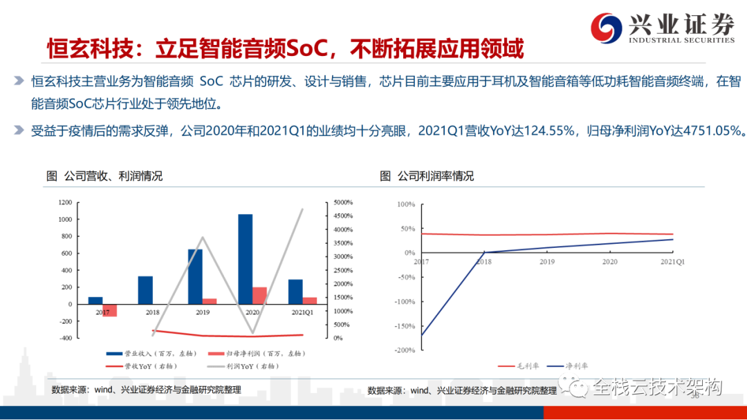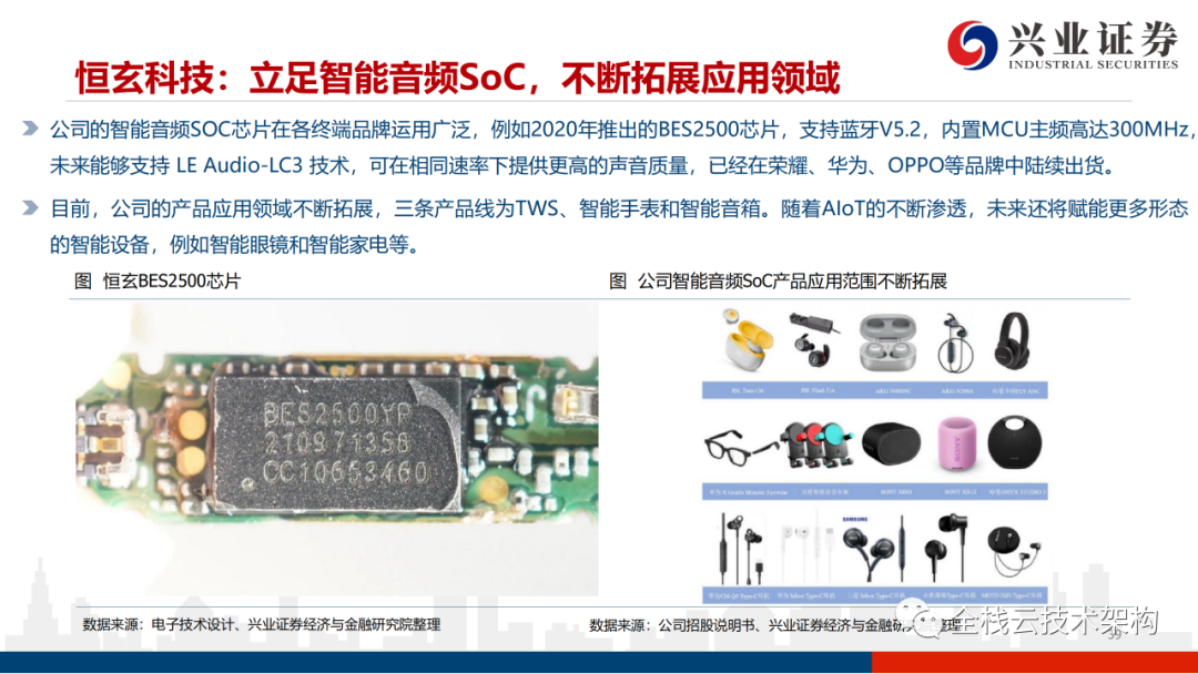 瑞芯微主要从事多媒体SOC的设计,产品包括智能应用处理芯片和电源管理芯片。应用处理器芯片的应用场景覆盖平板电脑、智 能机顶盒、智能手机、智能家居、汽车电子、智能安防等众多领域;电源管理芯片则主要为与应用处理器SOC芯片相配套的电源 管理芯片和手机快充芯片。凭借领先的芯片设计技术、较强的应用开发能力及良好的客户服务水平,公司拓展了大批优质客户。公司长期专注于智能应用、电源管理等芯片设计,从2014年开始公司向物联网和智能平台转型,推出了多款平台型产品如3288、 3399和3268等,具备很强的持续升级能力。此外,公司也推出了一系列新一代方案,从28nm升级到14nm、8nm等先进制程,性能实现25%提升的同时功耗降低35-40%, 成为国内领先的方案,为未来3年成长奠定了基础。恒玄科技主营业务为智能音频 SoC 芯片的研发、设计与销售,芯片目前主要应用于耳机及智能音箱等低功耗智能音频终端,在智 能音频SoC芯片行业处于领先地位。受益于疫情后的需求反弹,公司2020年和2021Q1的业绩均十分亮眼,2021Q1营收YoY达124.55%,归母净利润YoY达4751.05%公司的智能音频SOC芯片在各终端品牌运用广泛,例如2020年推出的BES2500芯片,支持蓝牙V5.2,内置MCU主频高达300MHz, 未来能够支持 LE Audio-LC3 技术,可在相同速率下提供更高的声音质量,已经在荣耀、华为、OPPO等品牌中陆续出货。目前,公司的产品应用领域不断拓展,三条产品线为TWS、智能手表和智能音箱。随着AIoT的不断渗透,未来还将赋能更多形态 的智能设备,例如智能眼镜和智能家电等。